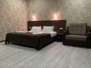 Характеристика номеров: 2-х местные номера класса «Люкс» с отдельным санузлом и душевой кабиной в каждом номере. В каждом номере есть сейф, фен и кондиционер. 2-х спальная кровать, шкаф, стол, стулья, холодильник, ТВ. Доп место кресло-кровать.