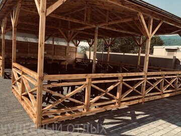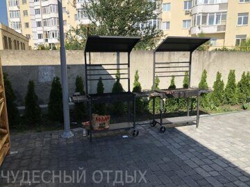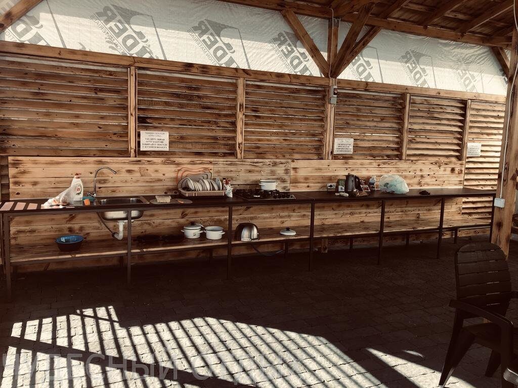 Питание: Большая беседка с кухней, оборудованной всем необходимым для приготовления пищи и несколькими мангалами для гриля и шашлыка.