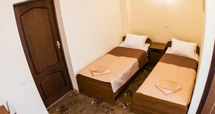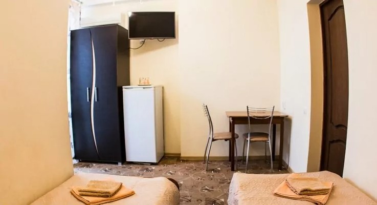 2-х местный номер стандарт: 2-х спальная или две односпальные кровати, телевизор, холодильник, стол, стулья, 2 тумбочки, санузел и кондиционер, балкон + ванные принадлежности. Площадь номеров 12 кв.м.