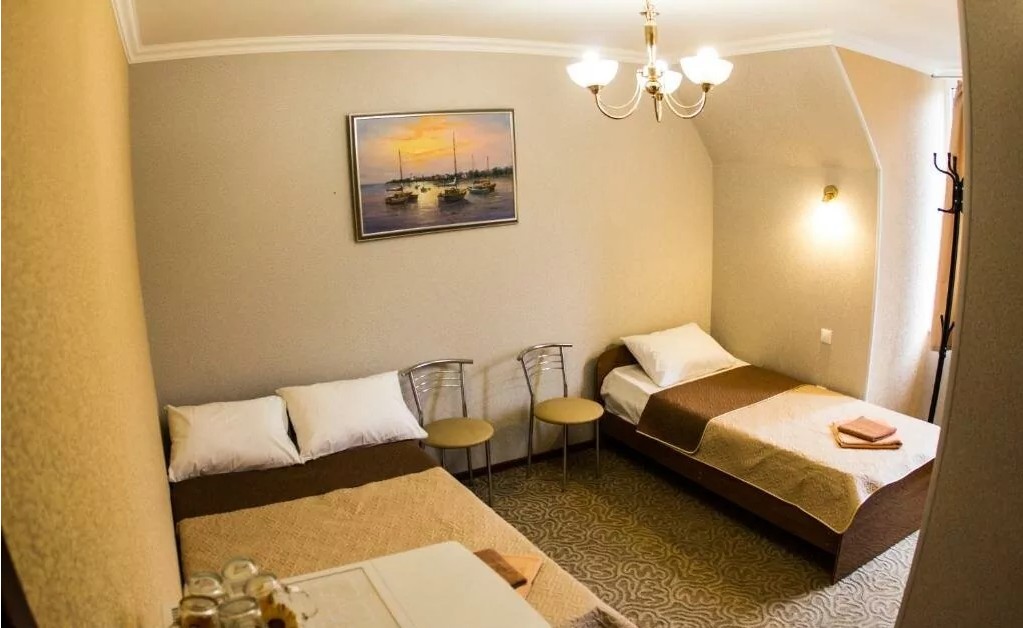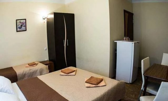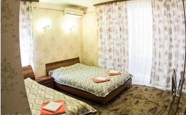 3-х местный стандарт: 2-х спальная и 1-но спальная кровати, телевизор, холодильник, стол, стулья, 2 тумбочки, санузел и кондиционер, балкон + ванные принадлежности. Площадь номеров 15 кв.м.