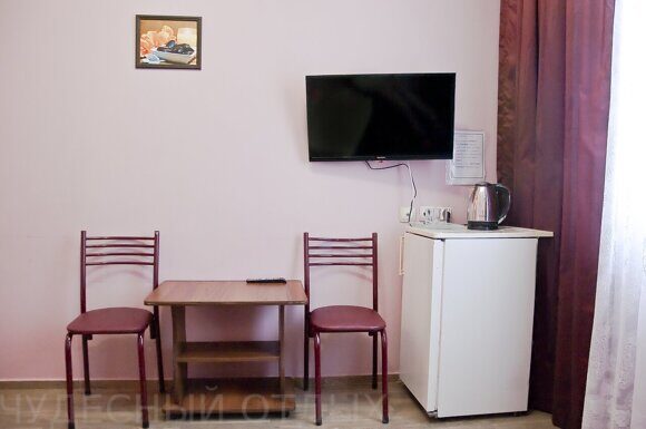 - 1-но местный номер: односпальная кровать, стулья, прикроватные тумбочки, стол, сплит-система, холодильник, телевизор, эл. чайник, санузел