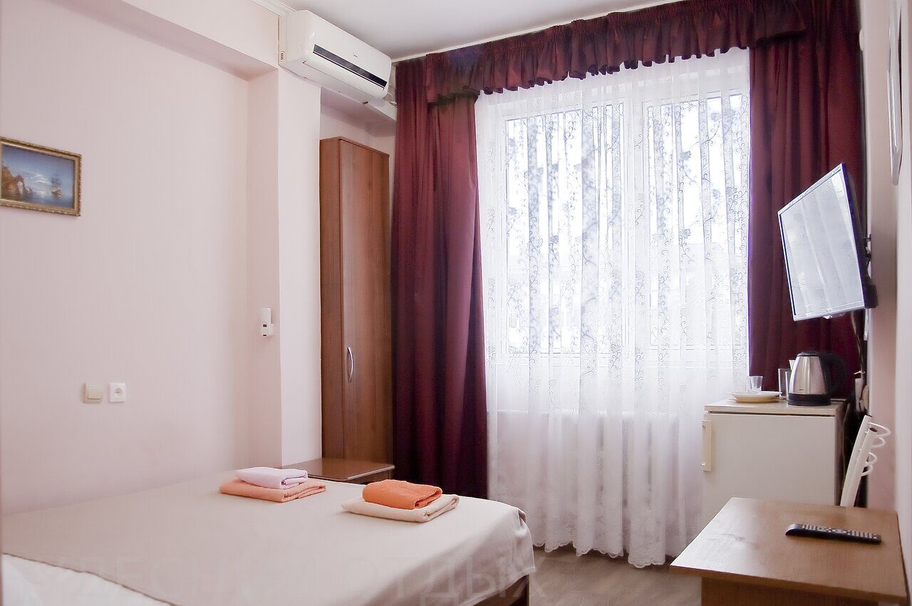 - 2-х местный стандартный номер. В номере: одна двуспальная кровать, шкаф, ТВ, холодильник, электрочайник, посуда, стол + стулья, кондиционер, санузел, Wi-Fi. Номер может быть дополнительно оборудован третьей (раскладной) кроватью.
